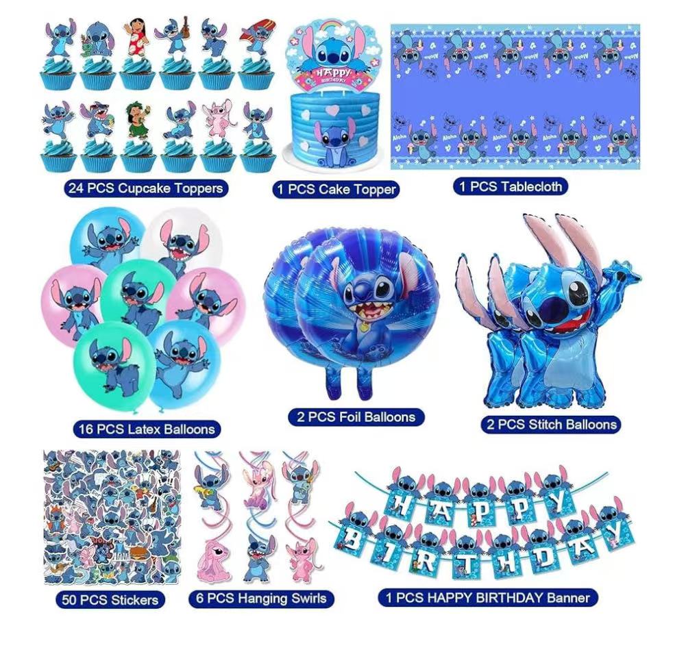 Wholesale: Stitch Party Supplies, Birthday Decorations Set Include Banner, Balloons, Stickers, Hanging Swirls, Cake Cupcake Toppers, Tablecloth for Boys Girls Stitch Theme Party